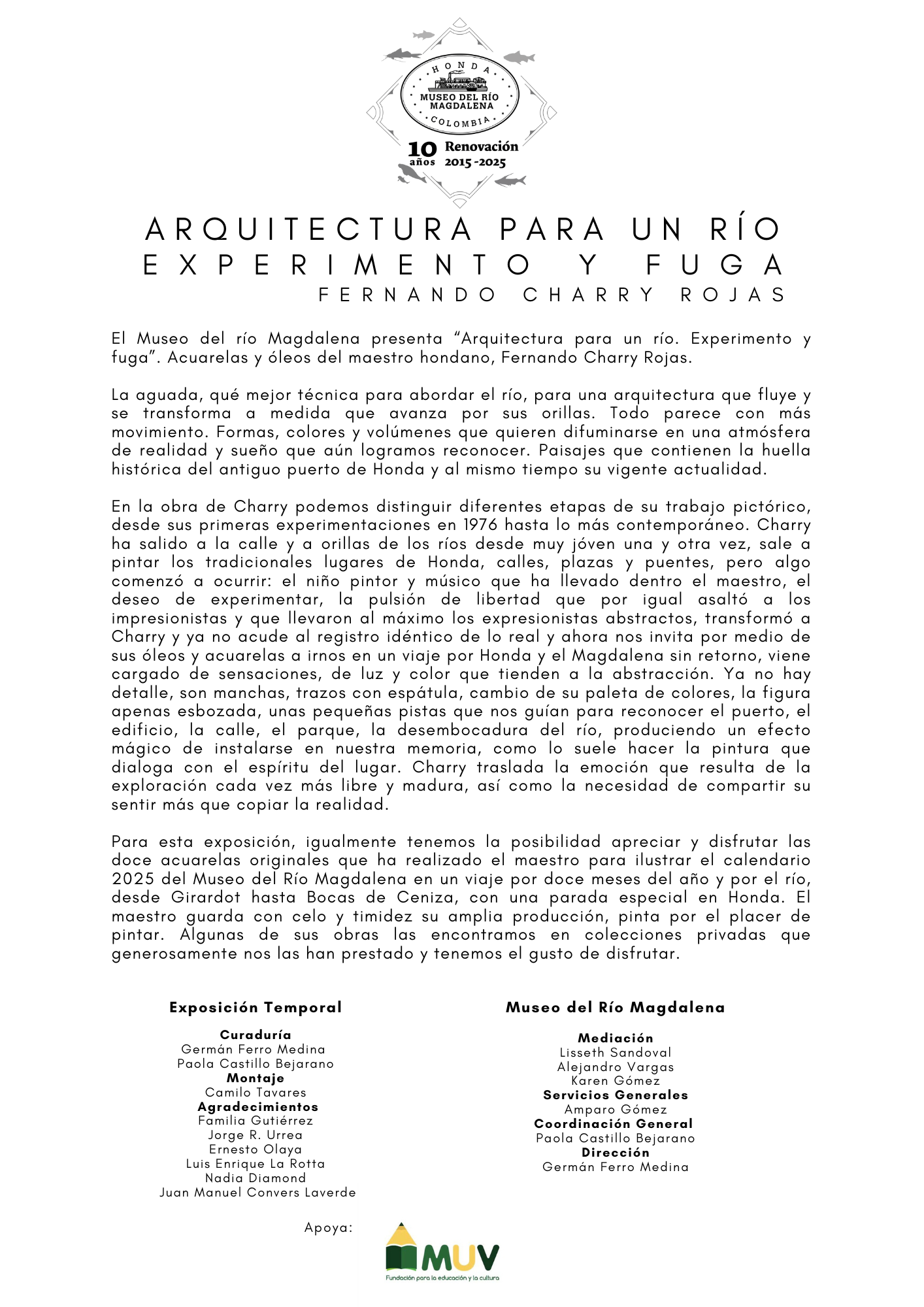 Para esta exposición, igualmente tenemos la posibilidad apreciar y disfrutar las doce acuarelas originales que ha realizado el maestro para ilustrar el calendario 2025 del Museo del Río Magdalena en un viaje por doce meses del año y por el río, desde Girardot hasta Bocas de Ceniza, con una parada especial en Honda. El maestro guarda con celo y timidez su amplia producción, pinta por el placer de pintar. Algunas de sus obras las encontramos en colecciones privadas que generosamente nos las han prestado y tenemos el gusto de disfrutar.