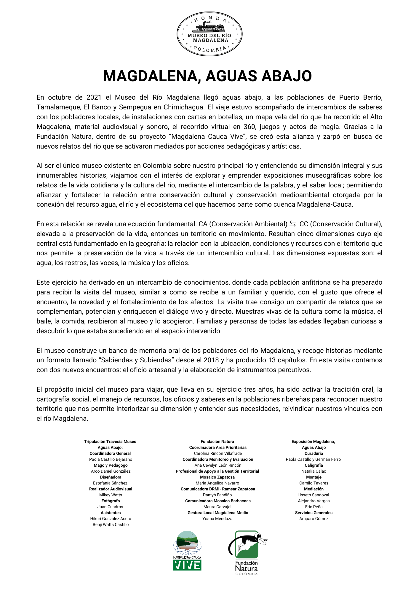 Al ser el único museo existente en Colombia sobre nuestro principal río y entendiendo su dimensión integral y sus innumerables historias, viajamos con el interés de explorar y emprender exposiciones museográficas sobre los relatos de la vida cotidiana y la cultura del río, mediante el intercambio de la palabra, y el saber local; permitiendo afianzar y fortalecer la relación entre conservación cultural y conservación medioambiental otorgada por la conexión del recurso agua, el río y el ecosistema del que hacemos parte como cuenca Magdalena-Cauca.