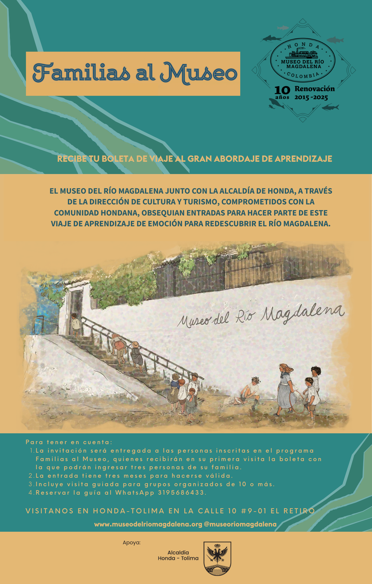COLEGIOS Y FAMILIAS AL MUSEO Este programa busca contribuir a que estudiantes y sus familias en Honda ingresen al Museo para disfrutar de una experiencia de viaje pedagógico que les transmita la emoción, el conocimiento y el compromiso con el Río Magdalena. Apoyado por la Alcaldía Municipal para incentivar a todas las familias Hondanas a conocer espacios culturales e incentivar los procesos de nuestro municipio.